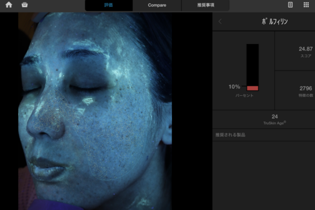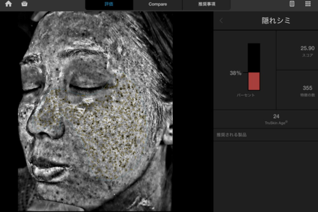 UV撮影を行うことにより、現状では肌の表面に出てきてはいない、将来的に出現する可能性のある隠れたシミを数値化してくれます。
