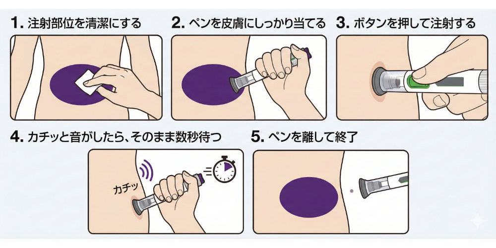 注射器の先端が直接見えない構造になっているため、 見た目の怖さを感じにくく、落ち着いて使えるのが特徴です。 -