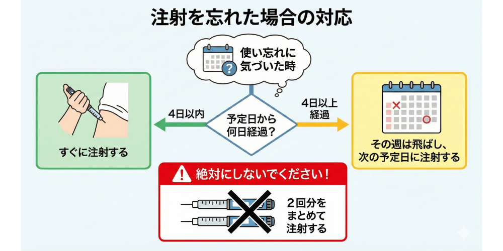 A注射予定日から4日以内であれば、気づいた時点で注射可能です。4日を過ぎた場合は、その週は飛ばして次の予定日に使用します。