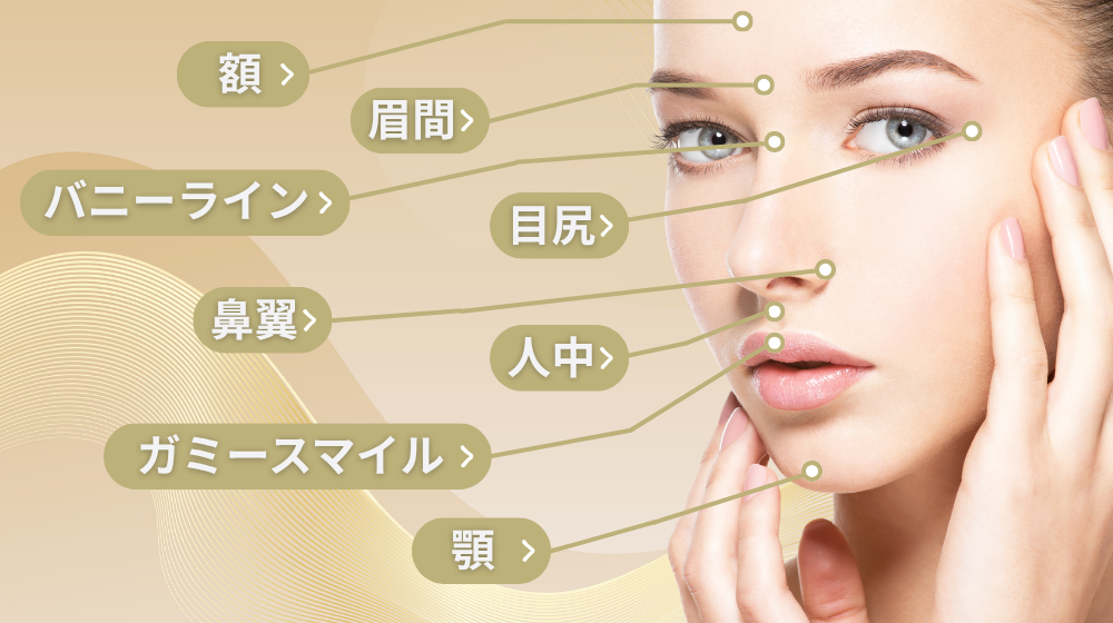 額、眉間、目尻、人中、口角、鼻翼、バニーライン、顎、ガミースマイル